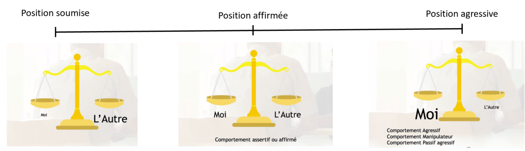 L’affirmation de soi se situe entre deux extrêmes : la soumission et l’agressivité. Voici comment ces trois positionnements se manifestent dans la communication :
